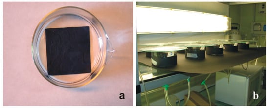 Figure 1. Experimental set-up for the evaluation of the settlement and metamorphosis ability of B. schlosseri larvae. (a) Glass-crystallising dish with a plate coated with an antifouling paint on the bottom. (b) Arrangement of the various glass-crystallising dishes in the thermostatic room at 22 °C.