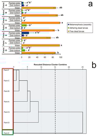 Figure 2. Effects of plates coated with seven antifouling paints on larval settlement and metamorphosis observed after exposure until all control larvae metamorphosed in the reference glass-crystallising dishes forming filter-feeding oozoids. (a) Percentages of three effects on metamorphosis, i.e., (i) complete metamorphosis with oozoid formation (blue), (ii) settled but dead larvae (green), and (iii) not-settled but free-floating dead larvae (orange). Larval mortality and abnormality were considered in three conditions: (i) individuals floating in the sea water (“water”), (ii) individuals adhering to the dish glass bottom peripheral to the painted plate (“dish bottom”), and (iii) individuals settled on the antifouling-coated plate (“painted plate”). Significant (p < 0.05) differences inside each of the three conditions obtained with Dunnett’s test are expressed with different letters. (b) Dendrogram obtained from cluster analysis with average linkage between groups. The cutting point at 15 corresponds to the maximum margin showing two clusters bordered by different colours.