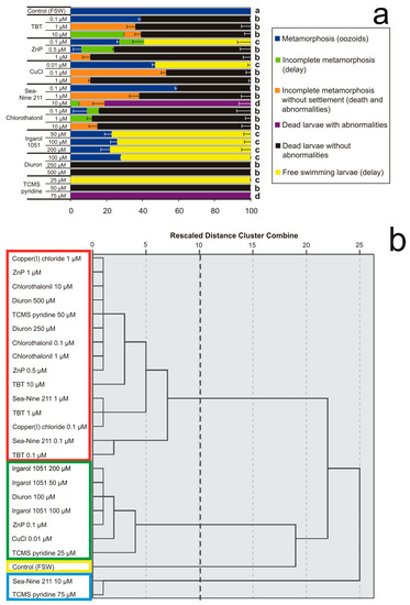 Figure 3. Effects of various concentrations of antifouling biocides in sea water on larval settlement and metamorphosis. (a) Percentages of larval mortality and abnormality observed after exposure until all control larvae in FSW completed the metamorphosis forming filter-feeding oozoids. Significant (p < 0.05) differences obtained with Dunnett’s test are expressed with different letters. (b) Dendrogram obtained from cluster analysis with average linkage between groups. The cutting point at 10 corresponds to the maximum margin showing four clusters bordered by different colours.