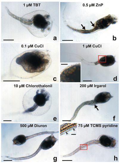 The larval abnormalities of the experiments reported in Section 3.2 were analysed under a light microscope (Figure 4). The most severe morphological effects in metamorphic development have been observed after exposure to 1 and 10 μM TBT (Figure 4a), Sea-Nine 211 and Chlorothalonil, 1 μM ZnP, and 0.1 μM CuCl (Figure 4c). In these cases, the initial metamorphosis was evident with the protrusion of ampullae and tail resorption at various degrees, but cephalenteron always appeared to be encased by an anomalous large bubble filled with a colourless fluid with small, scattered cells. Organotin compounds, zinc, copper, and Chlorothalonil are known to cause significant changes in hydromineral fluxes and membrane permeability, mechanisms that maintain osmotic homeostasis [49,50,51,52]. The bubble formation in B. schlosseri larvae could be the result of the disruption of osmotic control systems due to the direct action on lipid composition and/or ion transport across the plasma membranes. Regarding the tail resorption, TBT, Sea-Nine 211, and Chlorothalonil caused an abnormal extensive detaching of spherical-shaped cells throughout the entire tail length. These compounds are known to directly and indirectly inhibit a series of enzymes. In particular, Ca2+-ATPase is inhibited via biocide interaction with calmodulin [53]. This pump inhibition increases intracellular Ca2+ concentrations, which in turn provoke the depolymerisation of cytoskeletal components [54] and induce cell apoptosis [55]. The incomplete tail resorption with the persistence of apoptotic cells dissociated from the axial complex indicates the absence of phagocytosis, which is usually carried out by motile phagocytes able to engulf all dead cells and tissue debris [56], confirming the immunosuppressive activity of these biocides [28,29].