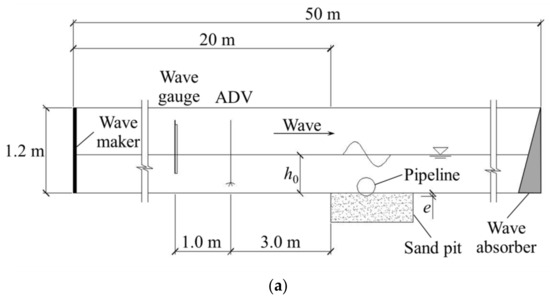 The experiments were conducted in a wave and current flume at the Laboratory of Hydraulic and Harbor Engineering, Tongji University. The flume is 50 m long, 0.8 m wide, and 1.2 m deep (Figure 1). The flume is equipped with a multi-functional wave generating system which can produce both regular and irregular waves, with wave periods ranging between 0.5 s and 5.0 s. The waves were generated with a piston-type wave maker installed at the upstream end of the flume. The maximum wave height is about 0.25 m at 0.5 m water depth. In this study, active wave absorption was adopted to mitigate wave reflection. Two independent wave gauges installed inside the wave generation system enable the wave generating system to measure the water surface profile and adjust the movement of the wave maker to minimize the effect of the wave reflection. The side walls of the flume are made of glass and the bottom is made of concrete. A wave-absorbing slope is located at the downstream end of the flume. A sand pit of 2.7 m long and 1.0 m deep is located 20 m downstream of the wave maker. The side walls and the bottom of the sand pit are all constructed of impermeable concrete. The velocity near the bottom of the flume was measured by a Nortek Vectrino high-resolution acoustic velocimeter (ADV) placed 3.0 m upstream of the sand pit. The sampling point of the ADV was located 0.11 m above the bottom of the flume. A wave gauge was set 1.0 m upstream of the ADV. The sand pit was filled with medium sand measuring at d50 = 0.283 mm, with a geometric standard deviation of σg = (d84/d16)1/2 = 1.8. The porosity of the bed sediment is 0.565, and the permeability is 2.8 × 10−5 m/s.