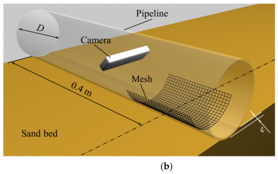 Before each test case, the sediment under the pipeline within the coverage of the mesh was removed and replaced gently. Then, the bed was leveled carefully. A similar arrangement was adopted previously by Sumer et al. [2] and Zhu et al. [34]. After that, an initial scour hole was dug beneath the model pipeline at about 15 cm from the edge of the camera view, thus ensuring that scour would begin at this specified point in all cases. When the scour hole extended into the view of the camera, the scour hole propagation rate was steady. If the scour development started at other locations, the test case would be repeated, and the video clip was discarded. The initial scour hole was set in the same way as that in Zhu et al. [18], where more detailed information on the setup of the initial scour hole can be found. Similar techniques can be seen in Cheng et al. [13,19].