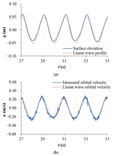 Measured wave characteristics compared with theoretical linear wave parameters: (a) water surface variation; (b) near-bottom wave orbital velocity.