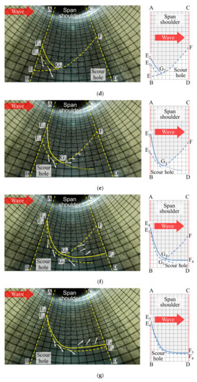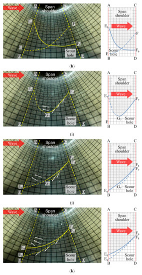 After that, the movement of the sand particles reversed and headed to the upstream side, indicating the start of the latter half of the scour process. The movement pattern was similar to the first half of the scour process, but in a mirror-imaged manner. The sediment near point F6 was scoured first. A new scour front formed and retreated to F7G7 [Figure 4i]. Then the deformation and movement of the original scour front started and the new scour front F8G8 extended to the upstream side [Figure 4i,j]. The new scour front retreated as it did in the first half of the scour process. The scour front retreated a little faster on the upstream side [point E in Figure 4j–l]. A similar phenomenon was also observed in the first half of the scour process. The scour process in this wave period ended at φ = φ0 + 2.034 π. The whole scour process took 2.034 s, which is nearly equivalent to the wave period (T = 2.0 s). This process repeated in the next wave period. Similar phenomena were also observable in the video clips of other test cases.