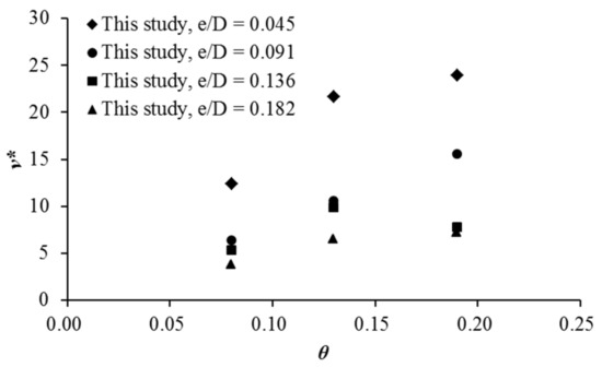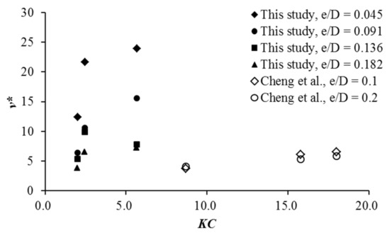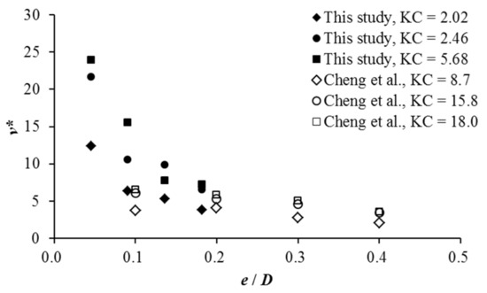 Figure 5 shows the variation of the normalized scour propagation rate v* with the pipeline embedment ratio e/D. The pipeline embedment e/D varied between 0.045 and 0.182. The results by Cheng et al. [19] in similar conditions are also plotted. Figure 5 depicts that the scour propagation rate generally decreases with the increase in the pipeline embedment ratio. The results in the present study share a similar trend with Cheng et al. [19], in that the decrease in the scour propagation rate is almost linear when e/D ≥ 0.1 for different KC numbers. The scour rate is more sensitive to the variation of the pipeline embedment when e/D < 0.1, which coincides with previous reports on steady currents [15]. The drop rate of the scour rate gradually slows down as the embedment increases when e/D < 0.1. With the increase in the pipeline embedment, the scour rate is less dependent on the KC number, as the data points with the same e/D but different KC get closer for larger e/D values.