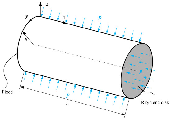 The geometry of the composite cylindrical shell with cantilever-like boundary conditions is shown in Figure 1. The length of the shell is L, including the left fixed boundary and the right rigid end disk. The radius of the middle surface is R. The composite cylindrical shell is subjected to uniform external hydrostatic pressure p, which can result in shell buckling.