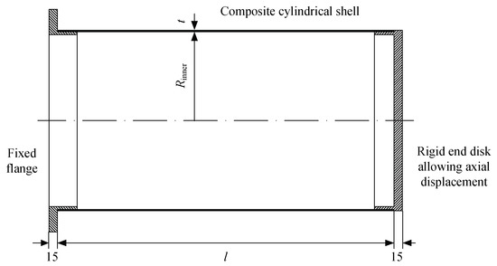 In this section, the results of calculations of the critical buckling pressure and buckling mode for the composite cylindrical shells with cantilever-like boundary conditions subjected to hydrostatic pressure are discussed. As shown in Figure 5, the composite cylindrical shell has an inner radius Rinner, nominal thickness t and length l. The dimensions of the shells and stacking sequences are listed in Table 1. The mechanical properties of the composite material are characterized by elastic moduli E11 and E22, shear modulus G12 and Poisson’s ratio v12 (listed in Table 2). The corresponding membrane and bending stiffness coefficients of the shell are calculated (see Table 3) by referring to [12].