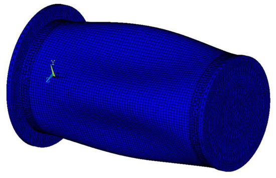 The instability pressure corresponding to the circumferential buckle wave number n varies from 2 to 6 and is solved by Equation (26), with the results listed in Table 4. According to Equation (26), the critical buckling pressure of the composite cylindrical shells is obtained. The buckling of the composite cylindrical shell with cantilever-like boundary conditions under hydrostatic pressure is analyzed using the finite element method. Both static and stability analyses are conducted in sequence in order to obtain the critical buckling pressure. The shell is modeled using a three dimensional structural element with six degrees of freedom at each node, involving translations in the x, y and z axes and rotations about the x, y and z axes. The results of the critical buckling pressure testing using the finite element method, analytical solution and experiments [12] are presented in Table 5. Following from the comparison, it can be seen that the deviations given by the analytical solution are 6.42% and 11.71%, respectively, while the deviations of the finite element analysis are 21.62% and 24.80%, respectively. For the buckling mode, the analytical solution and finite element method predict the same result, characterized by four waveforms in the circumferential direction (see Figure 6).