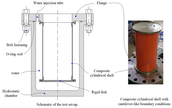 Buckling [3,4,5,6,7,8,9] is a major failure form for thin-walled composite cylindrical shells. Hajlaoui studied the buckling and postbuckling analysis of composite shell structures using modified first shear deformation theory [3,4], enhanced solid-shell elements and transverse shear correction [5,6]. Some researchers have investigated the buckling of composite cylindrical shells subjected to hydrostatic pressure using experimental methods. Carvelli [7] conducted off-shore testing and observed considerable deformation and the collapse instant of a glass-fiber-reinforced polymer cylindrical shell. Denardo [10] and Gupta [11] carried out experiments to reveal the mechanisms of shock-initiated buckling of a composite cylindrical shell. Hur [12] investigated the postbuckling of composite cylinders under external hydrostatic pressure. Ross [13] studied the buckling of carbon–glass composite tubes under uniform external hydrostatic pressure. Moon [14] researched the buckling of filament winding composite cylinders with three winding sequences of [±30/90]FW, [±45/90]FW and [±60/90]FW under external hydrostatic pressure for underwater vehicle applications. Tang [15] studied the failure mode of circumferentially corrugated cylinders under external hydrostatic pressure. In the abovementioned studies, the critical buckling pressure was determined by the instantaneous pressure when the composite cylindrical shell collapsed. An external hydrostatic test helped scholars understand the ultimate bearing capacity of the shell structure. In recent years, analytical and numerical methods have been widely used to predict the buckling of cylindrical shells subjected to hydrostatic pressure. Some researchers have studied the buckling strength of cylindrical shells, focusing on the influence of winding patterns [16] and imperfection [17,18,19]. Li [20] evaluated the critical buckling pressure of pipes under hydrostatic pressure by considering geometrical imperfections. Almeida [21] predicted the buckling load of composite tubes under external pressure, whereby cylindrical shells with various winding patterns were tested. Lopatin derived analytical solutions for the critical buckling pressure of composite cylindrical shells subjected to external pressure. One was for the buckling of cylindrical shells with rigid end disks under hydrostatic pressure [22], while the other was for a cylindrical shell with fully clamped ends loaded by lateral pressure [23]. Matos [24] presented a closed-form solution for the critical buckling pressure of underwater composite cylinders with arbitrary configurations. In addition, several studies [25,26,27,28,29,30] have been conducted on optimization design to enhance the buckling resistance of cylindrical shells. Messager [31] and Shen [32] used an optimization algorithm coupled with an analytical model to maximize the stability limits of thin-walled underwater composite cylindrical vessels. Lee [33] optimized the design load of a composite sandwich cylinder under external hydrostatic pressure by applying a micro genetic algorithm and finite element analysis. In the above studies, the optimization objective was achieved mostly by solving differential equations using the analytical method or finite element method. From reviewing the above studies, it was found that the buckling deformation behavior has rarely been reported. In one study, a cylindrical shell subjected to hydrostatic pressure was closed at both ends, which meant the deformation phenomenon was hard to observe. This motivated the authors to propose effective methods to study the buckling behavior of cylindrical shells. To this end, a new kind of cantilever-like boundary condition is constructed for composite cylindrical shells under hydrostatic pressure in this work. The buckling deformation behavior is studied using experimental and analytical methods.