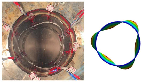 Furthermore, a composite cylindrical shell with a thickness of 3 mm, length of 405 mm and inner radius of 100 mm is produced using a T700-12K carbon–epoxy towpreg. The filament winding sequence is [±90]2/([±20]/[±90]/[±40]/[±90]/[±60]/[±90])2/[±90]. The mechanical properties are E11 = 102 GPa, E22 = 7 GPa, G12 = 8 GPa, v12 = 0.3. An external hydrostatic load testing is conducted in a hydrostatic chamber. As shown in Figure 7, one end of the shell is fixed on the flange and the other end is connected to the rigid disk. This structural form is equivalent to the cantilever-like boundary conditions. Water is continuously injected into the chamber to apply hydrostatic pressure. Thus, the composite cylindrical shell is submerged into the chamber and experiences external hydrostatic pressure on the shell and the rigid disk. Figure 8 shows the buckling mode observed in the test and using the finite element analysis. The critical buckling pressure and buckling mode obtained using the analytical method, FEM and testing are listed in the Table. Through the comparison, it can be seen that the buckling mode predicted by the analytical solution and FEM is consistent with the experimental result, which is characterized by three waves in the circumferential direction. As for the critical buckling pressure, both the analytical solution and FEM give relatively small deviations. Reviewing the buckling mode of analytical examples listed in Table 5 and Table 6, it is found that the initial configuration, such as stacking sequence, radius and length, causes changes in the first mode of buckling and critical buckling pressure of the shell.