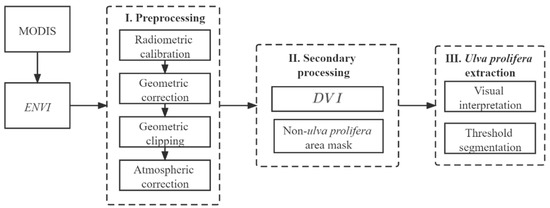 The steps of using MODIS images to extract Ulva prolifera are shown in Figure 2. Due to the radiation distortion, geometric distortion, atmospheric interference and other influencing factors in the original MODIS image (Figure 3a), it was first preprocessed in the ENVI (The Environment for Visualizing Images) software 5.3. For MODIS 02 level data, ENVI will automatically complete the calibration of the data when opening the data, and then use the satellite’s own geolocation file to perform geometric correction to eliminate the geometric distortion and “butterfly effect” of the MODIS data. Then the data were cut according to the scope of the study area, and finally the FLAASH correction tool (Fast Line-of-sight Atmospheric Analysis of Spectral Hypercubes) was used in ENVI to perform atmospheric correction on the image. FLAASH is based on the MODTRAN4+ radiation transmission model. The input file of the FLAASH module is the radiance value, the file type is BIL or BIP, and the data header file contains the center wavelength. In order to change the unit and data type of the input radiance value to a floating-point radiance value of μW/(cm2•nm•sr), the conversion coefficient of MODIS data was set to 10. Then, according to the image, information such as the latitude and longitude of the image center, the sensor type, the average altitude of the image area, the image pixel size, the imaging date and the imaging time are set. This paper selects the MODTRAN atmospheric model based on the season/latitude, the Sub-Arctic Summer model for the MODIS images in May, and the Mid-Latitude Summer model for the MODIS images in June and July. The urban is selected for the aerosol model, and the K-T aerosol inversion method is used. In the multi-spectral setting, the KT uplink channel selects the near-infrared band, and the KT downlink channel selects the red light band. In FLAASH advanced settings, adjacency correction is not used. After setting all the parameters, the atmospheric correction of the MODIS image is completed. Finally, the projection of each image is converted to the WGS_1984_UTM_Zone_51N projection coordinate system. The MODIS image after preprocessing is shown in Figure 3b, and some Ulva prolifera is seen on the sea surface.