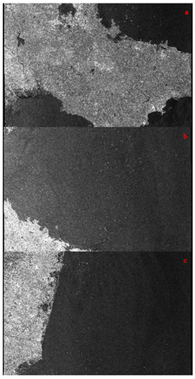 The width of the SAR image is 250 km, and at least three images are required to cover the South Yellow Sea area (Figure 4). Figure 5 is a VV image of the SAR L1 GRD mode in the South Yellow Sea region on 12 July 2021. The three images correspond to the regions a, b, and c in Figure 4, respectively. The SAR image has geometric distortion, radiation distortion and noise interference (Figure 5). This article uses SNAP (Sentinel Application Platform) software 8.0 to preprocess it. The preprocessing steps include orbit correction, thermal noise removal, radiation calibration, coherent speckle filtering, terrain correction, decibelization and mosaic (Figure 6 and Figure 7, respectively). The preprocessed flowchart and image are shown in Figure 8 and Figure 9, respectively.