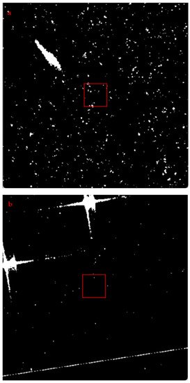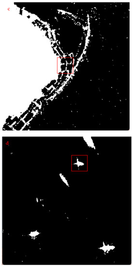 Before extracting Ulva prolifera, the SAR image was masked by land. After visual interpretation and dynamic threshold selection, it was determined that the optimal threshold for extracting Ulva prolifera was −15 dB. Figure 9 shows the results of Ulva prolifera extraction. In addition to Ulva prolifera pixels, the extraction results also contain fine spots, coherent speckle noise, splicing lines between images, land-coast pixels, ships, and coastal aquaculture areas (Figure 10 and Figure 11).