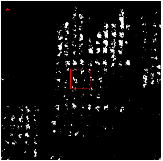 Non-ulva prolifera pixels after threshold segmentation. (a) Fragmented speckles; (b) Coherent speckle noise and splicing lines between images; (c) Land and coast; (d) Vessels; (e) Offshore aquaculture area.
