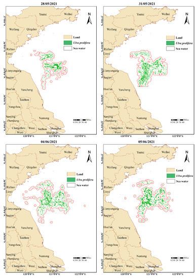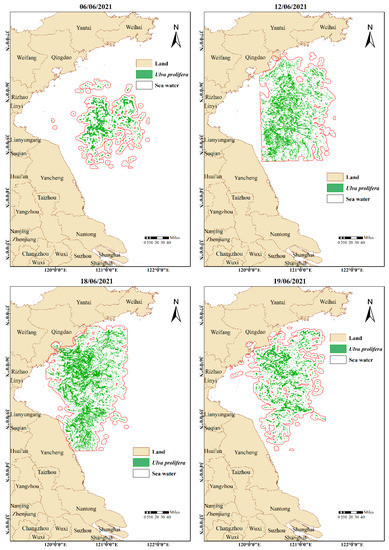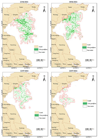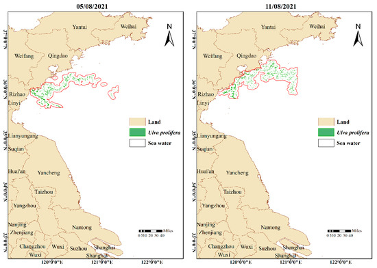 Figure 13 shows the remote sensing monitoring results of the Yellow Sea Green Tide in 2021. MODIS observed Ulva prolifera for the last time on 24 May, and SAR observed Ulva prolifera for the final time on 11 August. The green tide duration that can be monitored by remote sensing is 80 days.