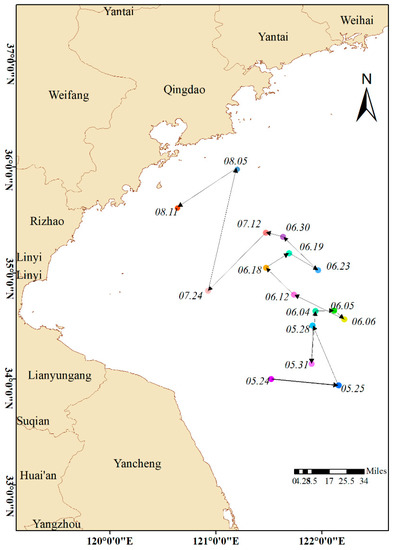 Connect the geometric centers of Ulva prolifera in sequence to obtain the drifting path of Ulva prolifera, as shown in Figure 14. Ulva prolifera was first detected by satellites on 24 May, located in the northern waters of Yancheng. From 24 May to 6 June, it drifted to the open sea along the northeast direction. After 6 June, it drifted to the northwest, passing through the waters of Lianyungang, Linyi, Rizhao and Qingdao, and finally staying in the waters of Qingdao. Ulva prolifera tends to gather, grow and expand to the north as a whole.