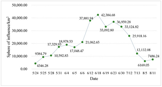 The range enclosed by the red line in Figure 13 is the range obtained after Euclidean distance analysis is performed on the extraction results of Ulva prolifera, and it is taken as the range of influence of Ulva prolifera. Figure 15 shows the change of the influence range of Ulva prolifera over time. According to the size and growth rate of the influence range of Ulva prolifera, it is divided into five stages: “discovery-development-outbreak-decline-extinction”. On 24 May, the satellite discovered Ulva prolifera for the first time, and its range of influence is 4346.28 km2. It can be inferred that Ulva prolifera was formed in mid-to-late May. From late May to early June, the impact area of Ulva prolifera continues to increase, and the growth rate is the fastest at the end of May. On 6 June, the impact area of Ulva prolifera reached 21,062.65 km2. From early June to mid-June, Ulva prolifera grows the fastest, with a sharp increase in the range of influence. It reached a peak on 18 June and the range of influence increased to 42,384.68 km2. After late June, the range of Ulva prolifera’s influence gradually decreased.