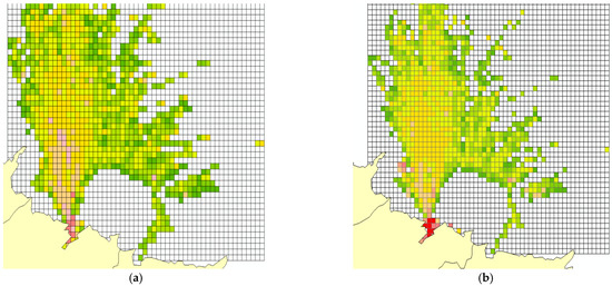 Based on the proposed SESSM methodology, Figure 9, Figure 10 and Figure 11 illustrate the simulation result of the distribution and density of carbon emissions in the nine different scenarios in the port area of Keelung. The colors in the grid (500 × 500 m2) represent the density of carbon emissions. Density is indicated (from low to high) as white, dark green, light green, yellow, orange, and red. The density indicator of carbon emissions (ton per cell in the grid) for different colors is presented in Figure 9.