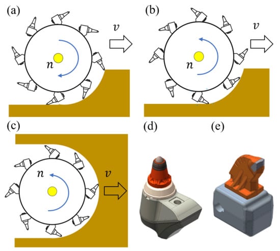Three cutting strategies are available, including down-milling, up-milling, and slotting [] as shown in Figure 3a–c. In the up-milling the cutting velocity keeps the same direction with the feed and in the down-milling it is opposite to the feed direction [].