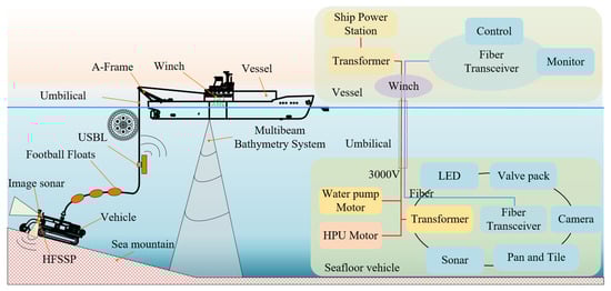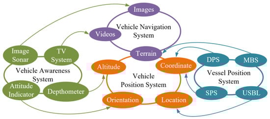 The right side of Figure 7 shows the vessel positioning system, including the Dynamic Positioning System (DPS), Multi-beam Bathymetry System (MBS), Ship Positioning System (SPS), and Ultra-Short Baseline (USBL). DPS and SPS can determine the vessel position in selected coordinates, while USBL can determine the vehicle’s position relative to the support vessel. MBS is used to obtain the topographic map of the operation area.