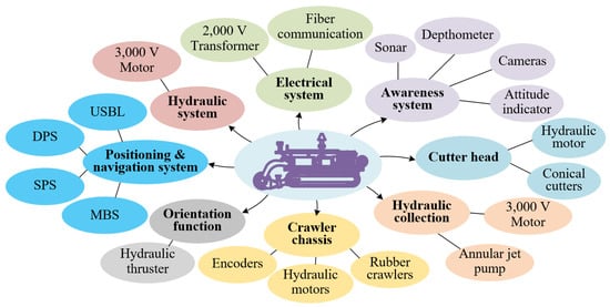 Figure 8 shows the entire system composition of the vehicle. Generally, it includes eight parts: crawler chassis, cutter head, orientation module, hydraulic collection, electrical system, awareness system, hydraulic system, and positioning and navigation system. The main functions and modules are also shown in the same figure. HFSSP is not shown here as it is a separate system. The electrical system provides energy and communication for the whole system.