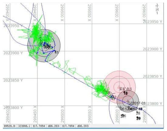 Trajectory diagram of the mining vehicle and support vessel (the green line is the vehicle’s trajectory, and the blue line is the support vessel’s trajectory).