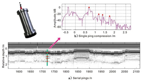 Figure 19 shows the sub-bottom profile results. The results of the ping from 1600 to 2100 are plotted in Figure 19a, while the top-right image, Figure 19b, is the single echo pulse compression curve at the ping 1720, in the green line, of Figure 19a. It can be seen from the curve that four strong scattering points are visible (red dots similar to the bottom image), which indicates the pulse compression performed well. The location of the surveying region was a mixture of sediments and rocks. The bottom figure shows a few segments with the stratum in the survey line represented by the green line ping with the hard substrate. Nonetheless, the tests data partially verified that HFSBP can measure a high-resolution seabed layer texture.