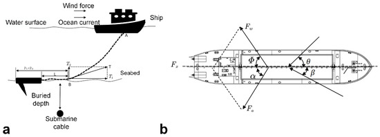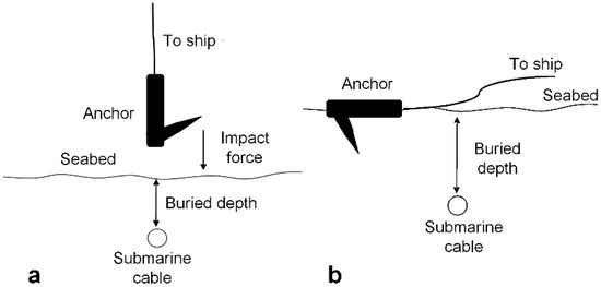 As shown in Figure 1, there are two types of anchor damage on submarine cables: impact and drag damages. If a submarine cable is located below the anchor point when a ship is anchoring, then the anchor may directly hit the pipeline while penetrating the seabed. Occasionally, the mooring point may be located near a submarine cable, so that the anchor is likely to hit the cable when it is dragged.