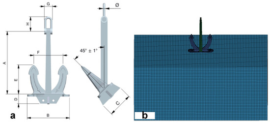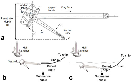 The maximum penetration depth of anchor dragging can be considered only to be related to the sum of the length of the anchor claw and the height of the anchor crown, and the maximum open angle of the anchor claw [24]. The state of the anchor after anchoring and dragging on the seabed is shown in Figure 4b,c.