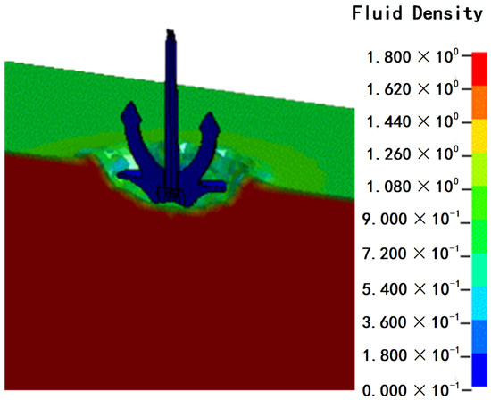 The penetration depth of the anchor with different mass and dropping velocity is analyzed. Different anchor masses (100 kg, 500 kg, 1020 kg, and 2100 kg) were dropped at the same velocity (4 m/s), and the 2100 kg anchor was dropped at different velocities (3.5 m/s, 4.5 m/s, and 5.81 m/s). The penetrating process of the anchor in the soil in the numerical analysis is shown in Figure 6. When the anchor hits the seabed, the soil is squeezed and quickly drained around, forming a bulge, As the anchor falls further, the uplifted soil fell back into the pit.