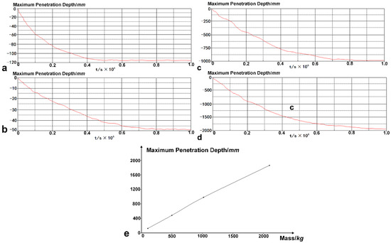 The maximum penetration depths of different anchor weights. (a) Case F1-1; (b) Case F1-2; (c) Case F1-3; (d) Case F1-4. (e) The relationship between the maximum penetration depth and the anchor weight.