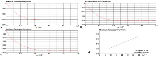 The penetration depth of the 2100 kg anchor with different bottoming velocities is analyzed, and the maximum bottoming velocity of 2100 kg anchor is 5.812 m/s (Section 2.1.1). The maximum penetration depths with different bottoming velocities is shown in Table 7.
