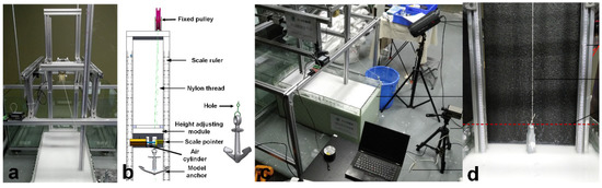 The experiment platform consists of a height-adjustable anchoring platform, soil tank, high-speed image acquisition system, and depth measurement module, as shown in Figure 10. The height-adjustable anchoring platform is mainly composed of a height-adjustable module, a cable recovery module and a sliding rail module. The bottoming velocity of the anchor is controlled by the dropping height of the model anchor.