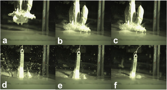 Take the case P1-4 as an example to analyze the kinematics characteristics of the anchor during the dropping process. Figure 11 shows the photos of the anchor at different falling positions captured by the high-speed camera. The soil is splashed around in Figure 11b,c, indicating that the surface soil gets a higher impact energy and speed when the anchor is penetrating, and the surface soil is quickly squeezed out.