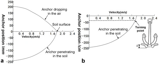 Dropping velocity versus dropping height and penetration depth. (a) The anchor dropping in the air and the soil. (b) The anchor penetrating in the soil and the turning point.