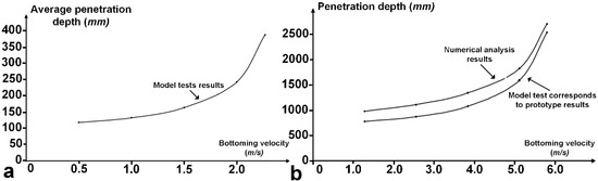 The penetration depth versus bottoming velocity of the anchor. (a) The results in the model test (b) The simulation results and the prototype results.