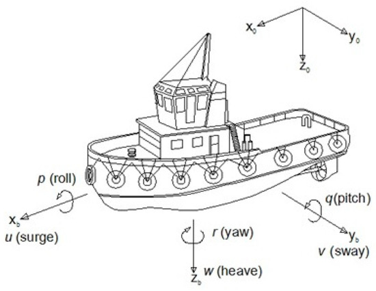 The dynamic ship system, described in an earth-fixed frame and a moving frame, was proposed by Fossen in 2002 [35]. We used the body’s fixed frame to study the ship system with six degrees of freedom, in order to describe a stabilizer control. The six degrees of freedom included: surge, sway, and heave (which describe translation) and roll, pitch, and yaw (which describe rotation). In this paper, the nonlinear equation of motion [11,36] can be given as follows: