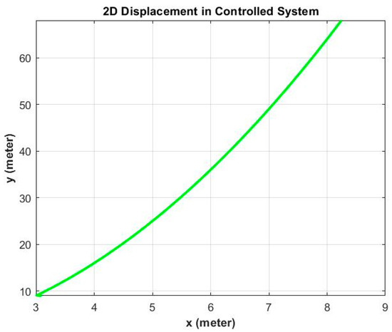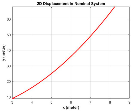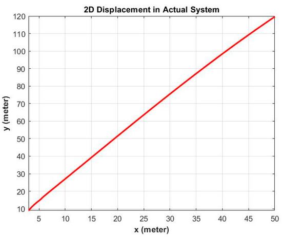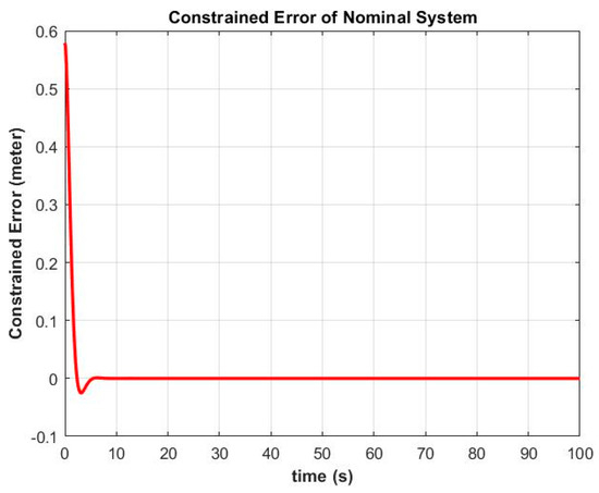 When we used the control force in the nominal system in order to control the ship system, we observed that the ship could follow the constraint Equations (20) and (21). The results of the nominal system are perfect in case of the system without uncertainties. Next, we considered the ship system subjected to uncertainties that have arisen in the system. Therefore, we considered uncertainties in the system by adding them to the mass matrix and the force vector, in order to describe the actual system. The uncertainty in the mass was assumed to be 20% of the nominal mass, and the uncertainty in the given force vector was assumed to be 30% of the nominal force. These uncertain forces can arise from wind, currents, and other environmental disturbances that affect the actual ship system. Under uncertain circumstances, the actual ship system is unable to follow the constraint Equation (21) without uncertainty control, as seen in Figure 9.
