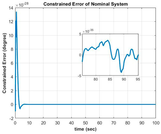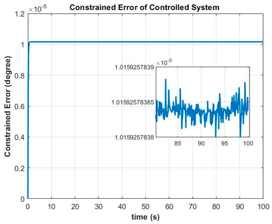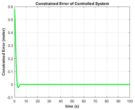 The plot in Figure 6 shows the error in the satisfaction of constraint Equation (20). We can see that the error is very small, due to the capability of the control force from Equation (34). In Figure 7, the error in the satisfaction of constraint Equation (21) shows a small value, similar to that in Figure 6. Even though the initial conditions start with an error, the trajectory stabilization (Equation (22)) can still make the system converge into the constraint trajectory, with minimal error.