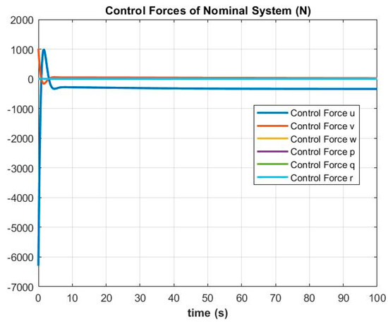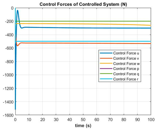 In Figure 8, the control forces are implemented for each of the generalized coordinates of the ship’s dynamic motion. The ship system is subjected to control forces, to guarantee that the system can follow the constraint Equations (20) and (21), respectively.