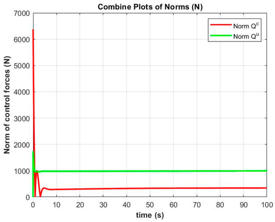 Figure 14 shows the norms of the comparison of the nominal control force and the additional control force . The norm of the nominal system is shown with a red line that describes the force generated from the use of the controller for the ship system to follow the constraint equations. Similarly, the norm of the controlled system is shown with a green line, demonstrating the force generated from the power of the controller to compensate for the uncertainties in the actual system. All of these forces guarantee that the ship system is able to follow the constraint equations with the proposed control forces.