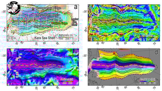 Sediment data (Figure 1c) were extracted from the ArcCRUST sediment grid data with a grid spacing of 10 km × 10 km [9]. ArcCRUST sediment grid data incorporates the latest sediment data of the Arctic Ocean.