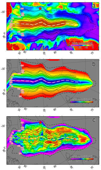 Topography and bathymetry grid data (Figure 1a) were obtained from International Bathymetry Chart of the Arctic Ocean Version 4.0 (IBCAO Ver. 4.0) [17] with a grid spacing of 200 m × 200 m. IBCAO Ver. 4.0 incorporates new shipborne data and constrains ~19.8% of the area of the Arctic Ocean with individual depth soundings. Modern multibeam bathymetry occupies ~14.3% of the area of the Arctic Ocean.