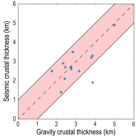 The Residual Mantle Bouguer Anomaly (RMBA, Figure 2c) was calculated by removing the thermal correction from the MBA. The RMBA reflects the deviation from the assumed crustal–mantle structure in a calculation, which is caused by the combined effects of crustal thickness, crustal density, and mantle temperature [16,24]. It is possible to obtain the maximum relative crustal thickness variations if assuming that the RMBA signal is only caused by crustal thickness variations. Here, the crustal thickness was calculated via the downward continuation of the RMBA to a constant depth using the method of Parker [25]. The downward continuation depth was set to be 7 km, i.e., the sum of the average water depth (4 km) and the average crustal thickness (3 km). The RMBA data was filtered using a cosine taper before downward continuation. There is a trade-off between the crust thickness and the crust–mantle density difference [26]. For the same RMBA, a larger crustal-mantle density difference will produce a smaller lateral crustal thickness variation [26]. In order to obtain the best crustal thickness model, we fixed the mantle density at 3300 kg/m3, assuming that the crustal thickness varies between 2700 kg/m3 and 2900 kg/m3 in steps of 500 kg/m3, and we calculated a series of corresponding crustal thickness models. Then, we compared these crustal thickness models with the crustal thickness determined by 13 seismic stations [5] and calculated the best fitting slope and RMS for difference between gravity-derived and seismically determined crustal thickness (Table 1). We found that the crustal thickness model with a crustal density of 2800 kg/m3 had both the smallest RMS and best fitting slope close to 1. Therefore, the crustal thickness model with a crust/mantle density contrast of 500 kg/m3 was considered to be the best crustal thickness model (Figure 3a).