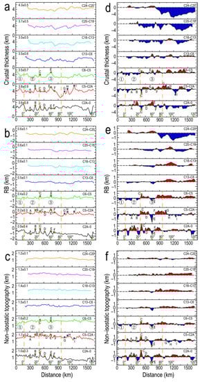 Furthermore, we obtained the non-isostatic topography by subtracting the isostatically compensated topography from the RB. Non-isostatic topography (Figure 3c) reflects the topographic features that are supported by lithospheric stress. A high non-isostatic topography value indicates relatively insufficient deep compensation and a topography supported by tectonic stress, while low non-isostatic topography value indicates that the lithosphere is in a state of relatively isostatically compensation.