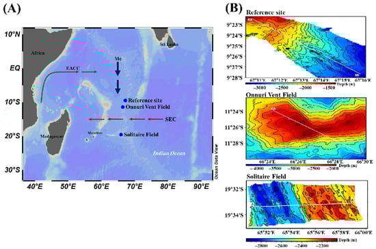 The OVF (newly discovered; 11°23.86′ S, 66°24.42′ E) and SF (19°33.4′ S, 65°50.9′ E) were the two vent fields selected in the Central Indian Ridge (CIR) to be investigated during a cruise of the R/V ISABU in June 2018 (Figure 1A,B). The CIR is known to be slow to intermediate spreading, with spreading rates varying from <12 mm/year to 50–60 mm/year []. The OVF is located at the summit of the Ocean Core Complex-3-2 and vents low-temperature fluids at depths of 1990–2170 m []. The SF is located on the Roger plateau on the western ridge of CIR segment 15 at a depth of 2634 m [,]. SF is characterized by chimneys that are less than 5 m in height and with fluid emissions of high pH 4.8 and approximately 10% lower chlorine levels than the ambient seawater []. The reference site (ref-site, MOCNESS tow: 09°22.4′–9°27.7′ S, 67°10.8′–67°15.8′ E) was selected outside of the immediate influence of the hydrothermal vent fields. The ideal location was north of OVF as the direction of transport of meridional Ekman flows from north to south during the boreal summer monsoon in June [].
