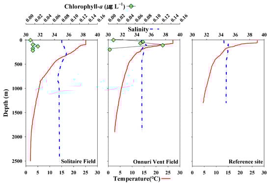 The vertical profiles of temperature (°C), salinity, and chlorophyll-a (µg L−1) of the surveyed stations at the Central Indian Ridge during a cruise of the R/V ISABU in June 2018.