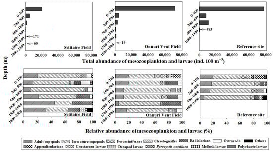 The total mesozooplankton abundance decreased with the depth, ranging from 60 to 19,522 ind. 100 m−3 (avg. 4348 ind. 100 m−3) in SF; 19 to 71,308 ind. 100 m−3 (avg. 13,452 ind. 100 m−3) in OVF; and 483 to 77,037 ind. 100 m−3 (avg. 24,352 ind. 100 m−3) in the ref-site (Figure 3). It is evident that the majority of the mesozooplankton abundance is accumulated at 0–200 m (euphotic zone) in both water columns above hydrothermal vent fields, which may be due to higher chl-a concentrations in the SCM (avg. 112.5 m). The abundance at 0–200 m was approximately 11 times higher than in other layers (200–1300 m) at the ref-site.