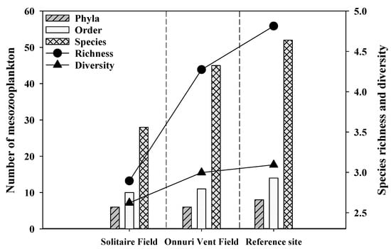 The morphologically identified numbers in the integrated water column were 28, 45, and 52 species in 6, 6, and 8 phyla at SF, OVF and the ref-site, respectively (Figure 4). The phyla Retaria (Foraminifera), Protozoa (Dinoflagellata), Crustacea (Ostracoda, Calanoida, Cyclopoida, Poecilostomatoida, Harpacticoida, Amphipoda, Euphausiacea, Decapoda), Chaetognatha (Sagittoidae), Chordata (Thaliacea, Doliolida, Appendicularia, Ichtyoplankton), and Mollusca (Gastropoda, Bivalvia) commonly appeared at both hydrothermal vents and the ref-site, while phyla Cnidaria (Hydrozoa) and Annelida (Polychaeta) only appeared at the ref-site (Figure 3 and Figure 4). Both the richness and diversity of the species were highest at the ref-site (richness: 4.8, diversity: 3.1) and lowest at SF (richness: 2.9, diversity: 2.6).