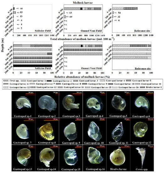 The quantitative measurements of mesozooplankton including holoplankton and meroplankton were conducted in the OVF, SF, and ref-site. The integrated abundance of mesozooplankton over the water column was relatively higher in the ref-site (77,037 ind. 100 m−3) than in the vent sites (avg. 53,398 ind. 100 m−3). It is evident that most of the mesozooplankton was accumulated in the euphotic zone (0–200 m). Mollusk larvae (gastropods and bivalves) appeared at all stations. Only one species of bivalve larva that appeared at the OVF and ref-site (0–200 m) was morphologically similar to Bathymodiolus spp. that inhabits the hydrothermal vents. The gastropod larvae were morphologically identified as holoplanktonic and meroplanktonic. Sixteen species of gastropod larvae were distinguished morphologically. Gastropod larvae species 1–4, 6, and 13 had holoplanktonic features (Atlanta, Oxygrus, and Limacina), while gastropod species 5, 7–12, and 14–16 had meroplanktonic features. Gastropod larvae species 5, 11, and 12 only appeared at OVF, 9 and 10 only appeared at SF, 4–16 appeared only at ref-site, and gastropod larvae species 7–8 appeared in all surveyed stations. Gastropod larvae species 5, 8, 12, 14, and 15 have similar morphological features to the macrobenthic gastropod larvae of Vetulonia spp. Gastropod larvae species 7 have morphological features similar to gastropods Lepetodrilidae, and species 9–11 and 16 have morphological features similar to Phymorphynchus protoconchs. The morphologically identified mollusk larvae of gastropods and bivalves in the upper layers of the water column (0–200 m) indicate that larvae associated with the hydrothermal vents may disperse approximately 2000 m above the vents.